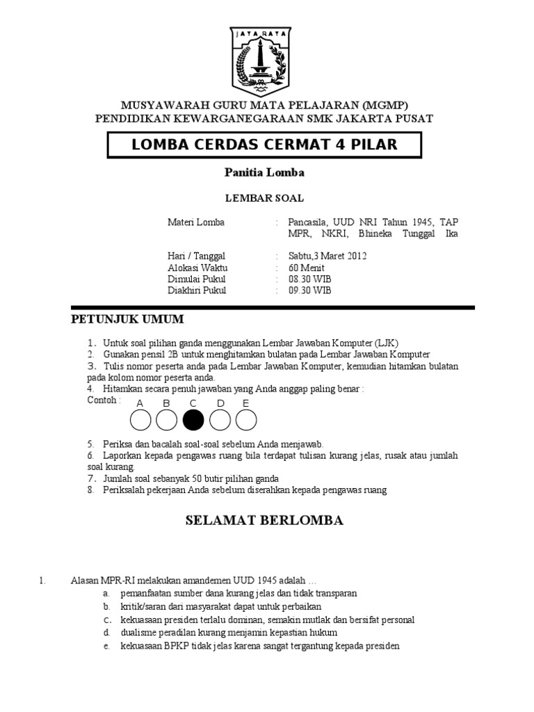 Contoh soal dan kunci jawaban ujian pjok kurikulum 2013. Soal lcc olyimpiade ipa ini dipergunakan setelah babak penyisihan peserta. Ini bisa di jadikan untuk latihan pembelajaran guna mengikuti perlombaan nanti dan di bawah ini adalah soal lomba cerdas cernat untuk smp silah kan di simak soal babak final pertanyaan wajib untuk setiap regu benar nilai 100, salah nilai 0. Soal latihan cerdas cermat ipa tingkat smp/mts jumat, 04 maret 2016 1. Lomba cerdas cermat tingkat smp.